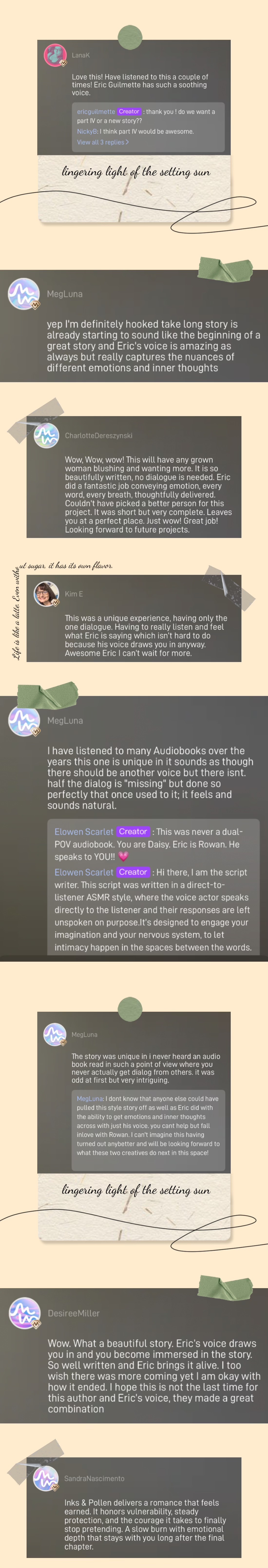 Early listeners of Inks & Pollen consistently highlight two things: the emotional authenticity of the story and the warmth of Eric Guilmette’s voice performance.